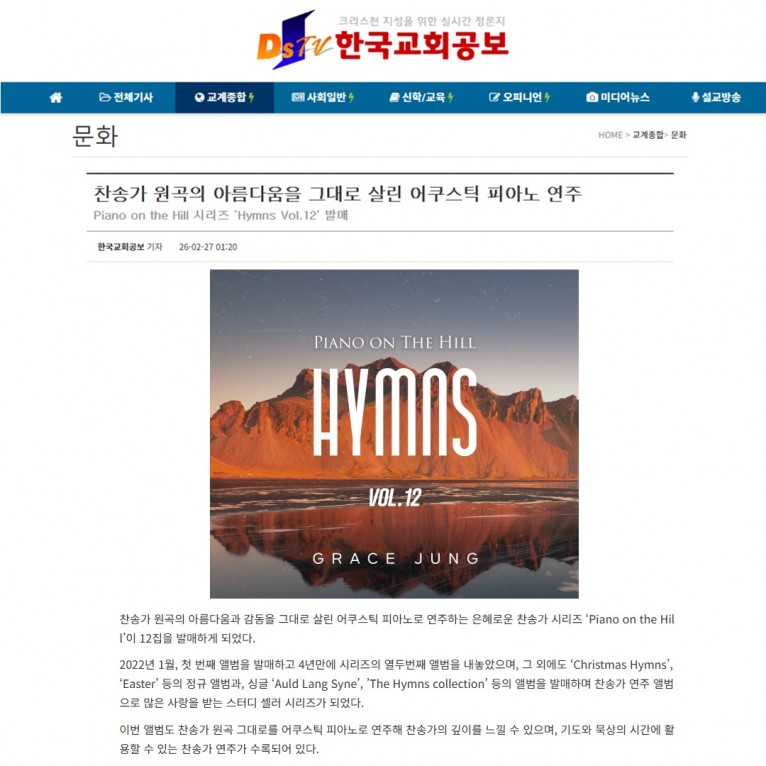뮤직타임 [기사] 찬송가 원곡의 아름다움을 그대로 살린 어쿠스틱 피아노 연주(한국교회공보)