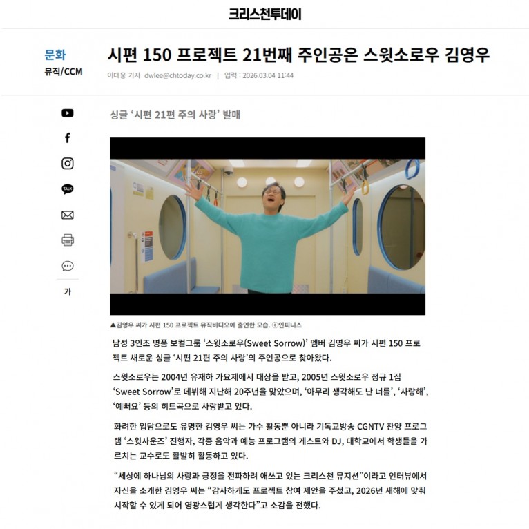 [기사] 시편 150 프로젝트 21번째 주인공은 스윗소로우 김영우(크리스천투데이)