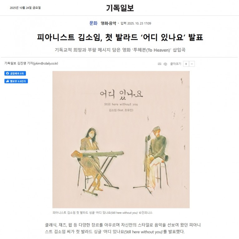 [기사] 피아니스트 김소임, 첫 발라드 ‘어디 있나요’ 발표(기독일보)