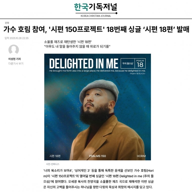 [기사] 가수 호림 참여, '시편 150프로젝트' 18번째 싱글 ‘시편 18편’ 발매(한국기독저널)