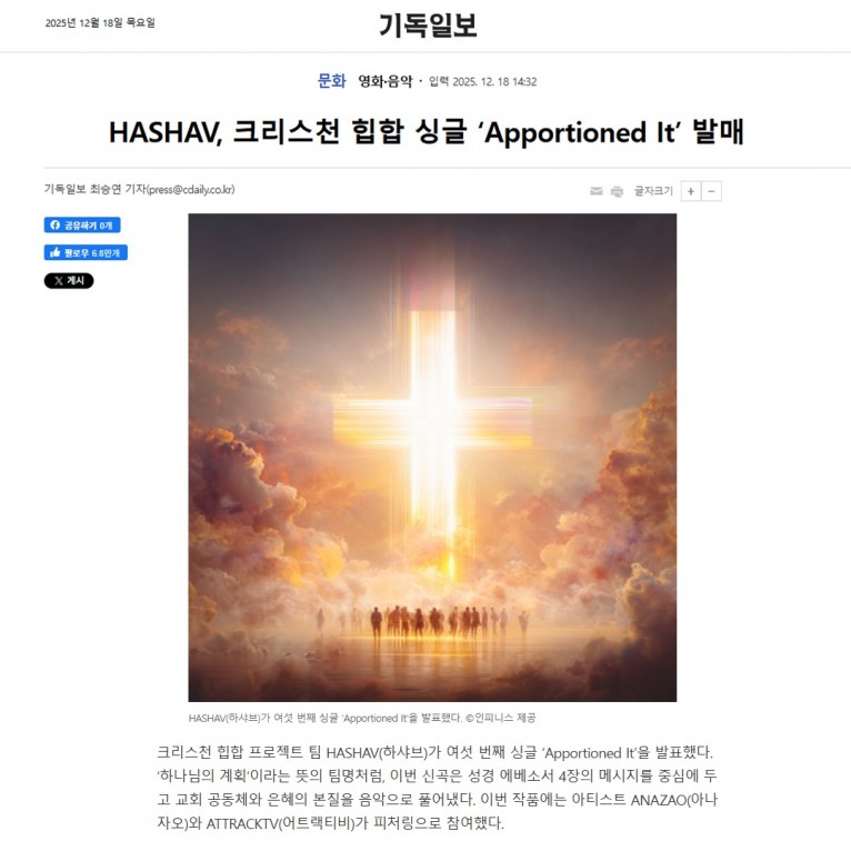 HASHAV는 성경 본문에 근거한 신학적 메시지를 현대적인 음악 언어로 구현하는 CCM 프로젝트 프로듀싱 팀으로, 예배와 삶, 그리고 공동체를 연결하는 작업을 지속적으로 이어가고 있다. 이번 싱글 ‘Apportioned It’ 역시 이러한 방향성 속에서 공동체와 은혜의 의미를 다시 묻는 작품으로 소개됐다.